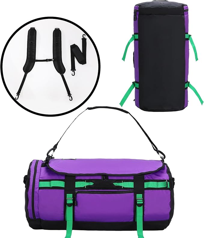 - Water Repellent Duffel ---- Built from heavy-duty water resistant tarpaulin and reinforced double layered tear-resistant floor panel, designed for harsh environments and features huge capacity to hold your workout gear or your trip stuffs. Best for hiking, camping, climbing, gym sports, car trip, traveling or other outdoor adventures
