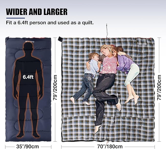 - Ultimate Warmth for Cold Weather: This flannel sleeping bag is designed for temperatures ranging from 10-25℉, featuring a thick 6 lbs of short cotton filling that ensures you stay warm during chilly nights while camping or for outdoor adventures.