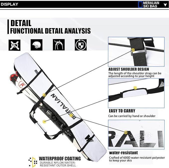 - ★.PREMIUM SKI BAG:Reinforced construction with double stitching and made of 600D water resistant nylon material is used to resist sharp edges and corners and hard rocks.