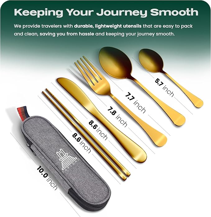 - ✅ Providing a fancy dine-in experience anywhere around the globe: This travel utensils Set with Case has 5 portable utensils including a spoon, dessert spoon, fork, butter knife, and chopsticks, Camping utensils set is Portable, lightweight, and durable travel cutlery for outdoor adventures.