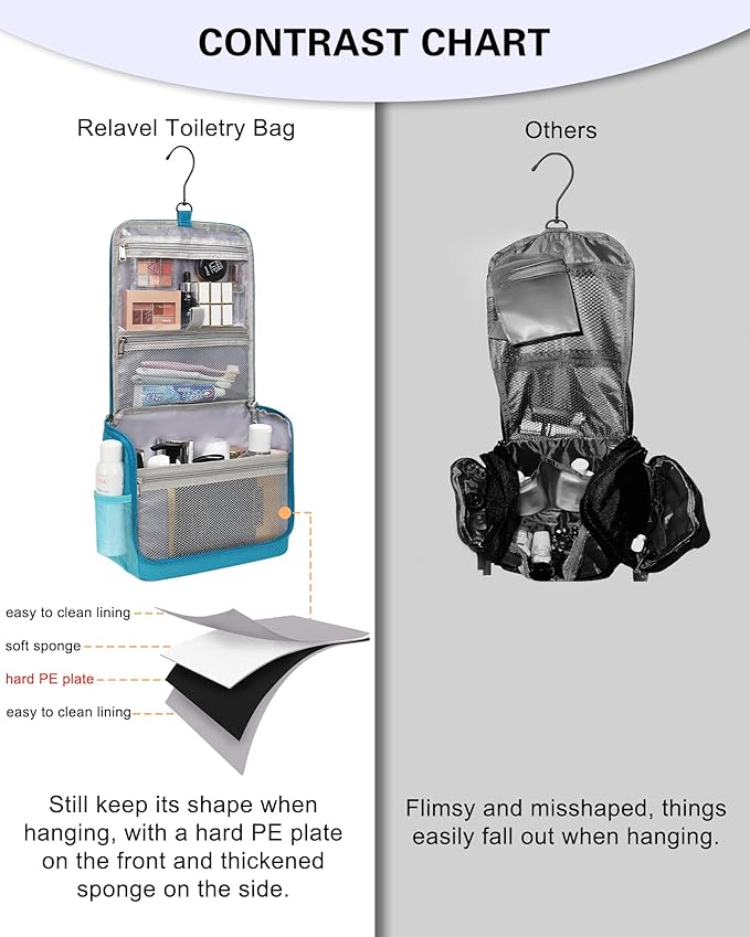 - Unique Design: Relavel toiletry bag has a unique design with a hard PE plate of the main compartment, keeps its shape when hanging, does not worry about dropping things, easy access to the items. More convenient and practical than the same type of toiletry bag on the market. Fully open design that gives you a comprehensive glimpse of your stuff.