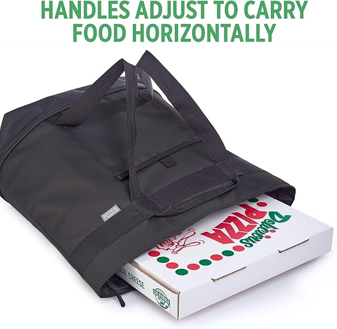 - Hot Food Stays Hot: The sturdy webbing belt handles adjust to carry pizza, carry-out and home cooked dishes horizontally to avoid spills, while the 3 layer travel cooler keeps your food hot as you drive across town! Inside easily wipes clean