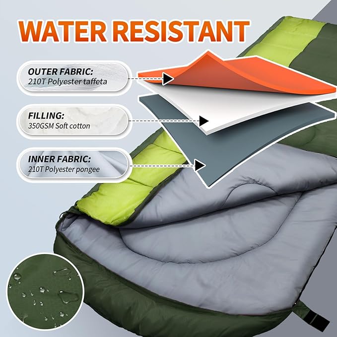 • COMFORT AND DURABLE: The outer material of the sleeping bag for adults is polyester ripstop, while the inner lining is made of polyester pongee. It is not only soft and cozy but the outer material is also water-resistant, providing added protection against spills and moisture