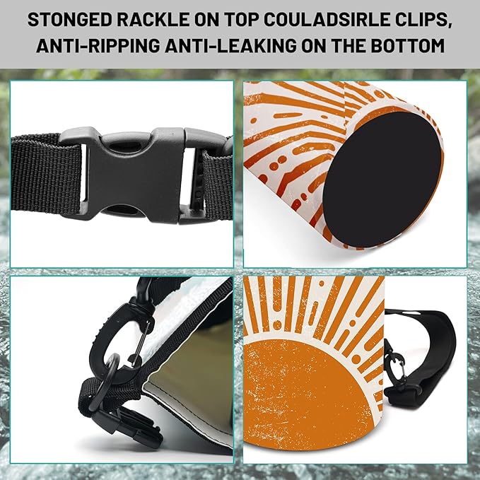 - Versatile Use for Every Adventure:Our Modern Yellow Sunburst Sunrise waterproof backpack perfect for kayaking, camping, rafting, and hiking, our multifunctional dry bag adapts to various outdoor activities.IPX8 CERTIFIED WATERPROOF PHONE CASE: Included with your dry bag is an IPX8 certified waterproof phone case, compatible with phones up to 6.5 inches. Its snap-and-lock access and dual-sided clear windows allow for photos while keeping your device safe and dry.