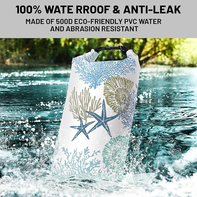 - Versatile Use for Every Adventure:Our Nautical Coastal Ocean Beach Seashell Starfish waterproof backpack perfect for kayaking, camping, rafting, and hiking, our multifunctional dry bag adapts to various outdoor activities.IPX8 CERTIFIED WATERPROOF PHONE CASE: Included with your dry bag is an IPX8 certified waterproof phone case, compatible with phones up to 6.5 inches. Its snap-and-lock access and dual-sided clear windows allow for photos while keeping your device safe and dry.