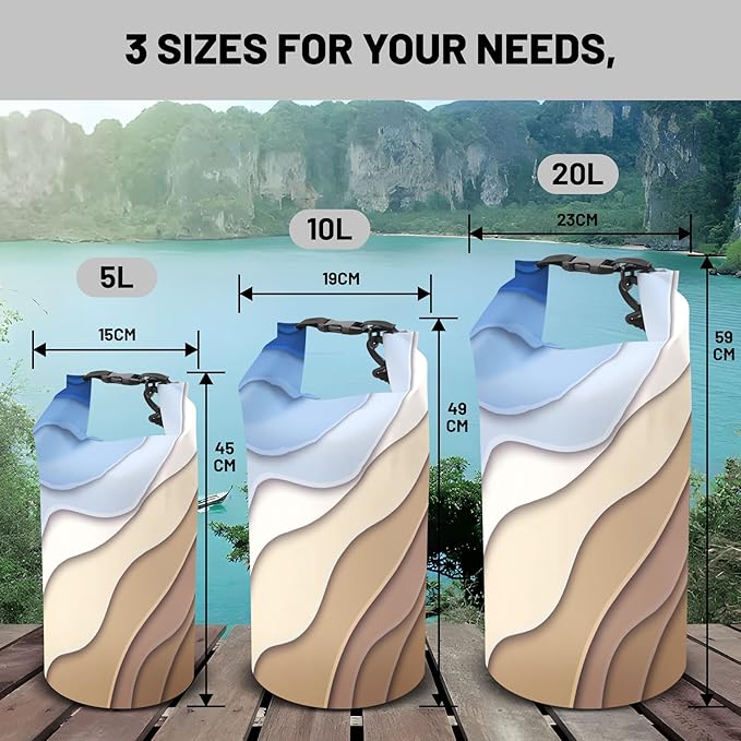 - Adjustable Carrying Options: Available in 5L and 10L with a removable shoulder strap for cross-body carry, or a 20L version featuring two adjustable straps for backpack-style comfort.Roll-top closure system provides secure watertight seal, keep your gear dry in any wet situation.Unique Aesthetic Abstract design dry bag backpack Carry it your way!