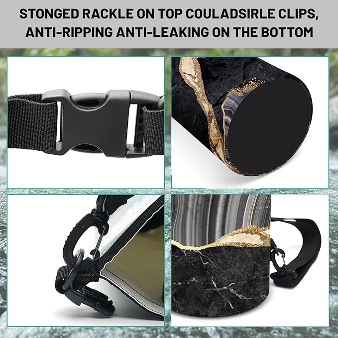 - Adjustable Carrying Options: Available in 5L and 10L with a removable shoulder strap for cross-body carry, or a 20L version featuring two adjustable straps for backpack-style comfort.Roll-top closure system provides secure watertight seal, keep your gear dry in any wet situation.Unique Abstract Gray and Black Golden design dry bag backpack Carry it your way!