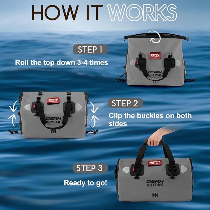 • WATERTIGHT PROTECTION: OSAH DRYPAK duffel bag is made of durable high-strength PVC, which is completely waterproof & snowproof. Ideal weekender bag for all your sailing, fishing, camping, sporting, boating, and motorcycling travel adventures.