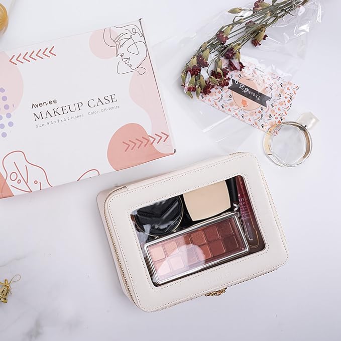 Aveniee Clear Makeup Bag Organizer, Portable Travel Toiletry Cosmetic Bag Case for Women, Heavy Duty Vegan Leather Make Up Pouch with Transparent Vinyl Windows & Gold Zippers 2pcs(Beige)