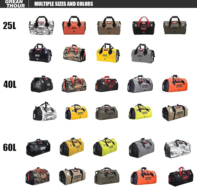 - CAPACITY MEETS DEMAND: This motorcycle tail bag comes in three sizes: 25 liters, 40 liters, and 60 liters, providing you with spacious storage space;Equipped with MOLLE connection points for hanging keychains and water bottles, as well as stacking other bags upwards to enhance expandability; There is an air valve on the outside, which maximizes the capacity by releasing excess air inside the bag