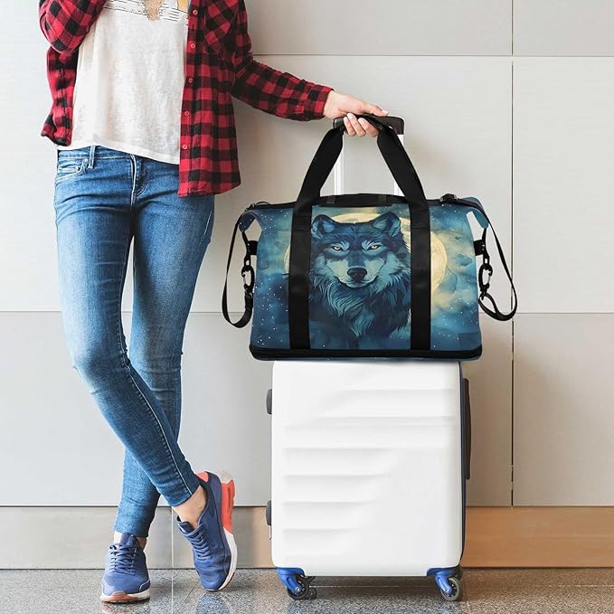 Wolf Moon Night Travel Duffel Bag Waterproof Gym Sport Tote Bag Carry On Weekender Bag with Compartment