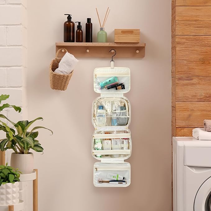 - Easy to Use: The toiletry organizer bag comes with a stow-away 360°rotation metal hook make it easy to hang on the towel rack, door knob or anywhere, so you can easily access this hanging makeup bag in hotel rooms, bathroom, and showers. Carry handle doubles as its hanging strap.