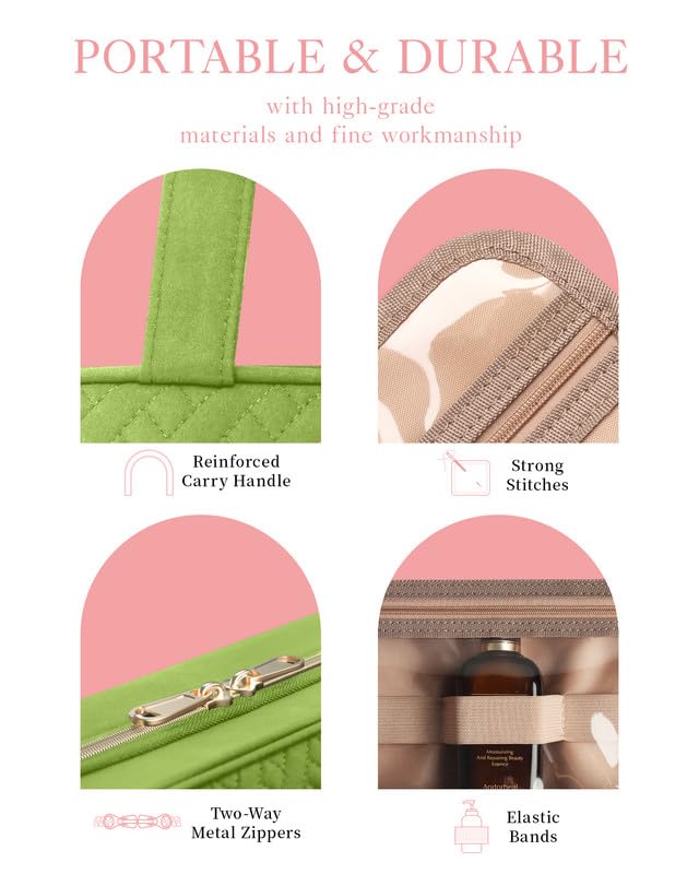 - MULTIPLE STORAGE COMPARTMENTS: Catering to the needs of women travelers, this travel toiletry bag for women boasts four main compartments, three of which are equipped with zippers for secure storage. The practical transparent pockets enable easy access to specific items without fully opening the bag. The innovative leakproof PVC pockets effectively segregate wet items from dry ones, accommodating a range of essentials from vitamins and makeup products to electronic devices and charging cables.