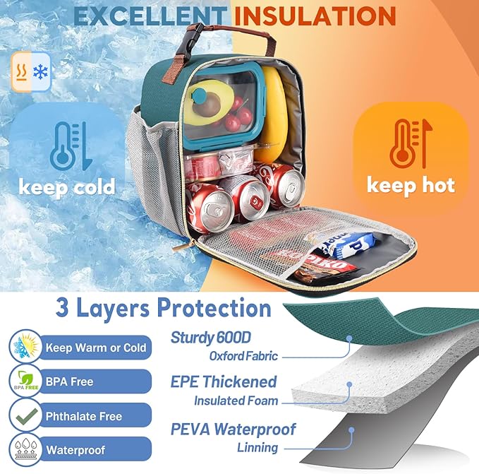 - Additional Pocket: The mesh pockets on the side of the insulated lunch bags for women and lunch bag for kids can hold an umbrella and a water bottle, and the zippered pocket on the front can hold a cell phone,cutlery, napkins, keys and other small items.The dual smooth zippers is easy to open or close