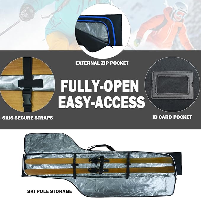 - WELL-ORGANIZED : Ski and boots bag enough to hold skis, boots, helmet and skiing gear; Ski bag with full-opening dual zipper for easy access; External zip pocket for item storage; Internal adjustable straps secure your ski; The separate interior compartment for ski poles