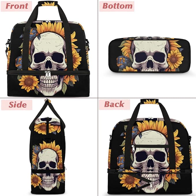 cfpolar Woman Travel Duffel Bag Sunflower Flower Skull Foldable Tote Carry On Luggage Sports Gym Bag With Shoe Compartment Overnight Weekend Yoga Workout Bag Training Handbag