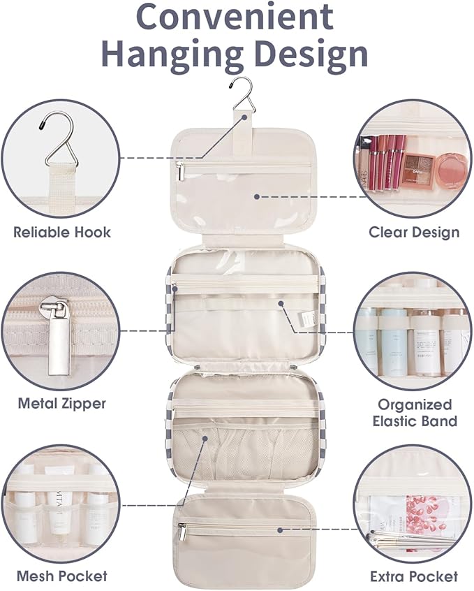 - NOT BULKY DESIGN - Large Capacity yet compact design, weighing 14 ounces. large metal hook allows hanging the toiletry case from towel rack, coat hook or whereever is available, making your toiletries and cosmetics displayed well for easy access