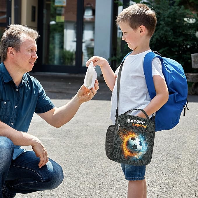 - Black Fire Soccer Lunch Tote: Ice and fire wrapped in soccer, the 3D graphics are eye-catching and passionate, and kids who love sports will love it