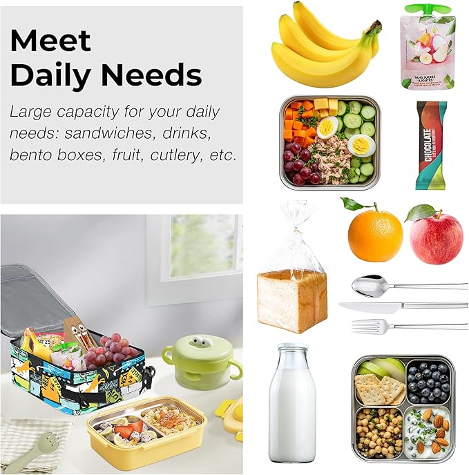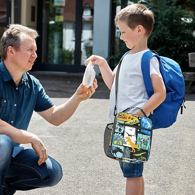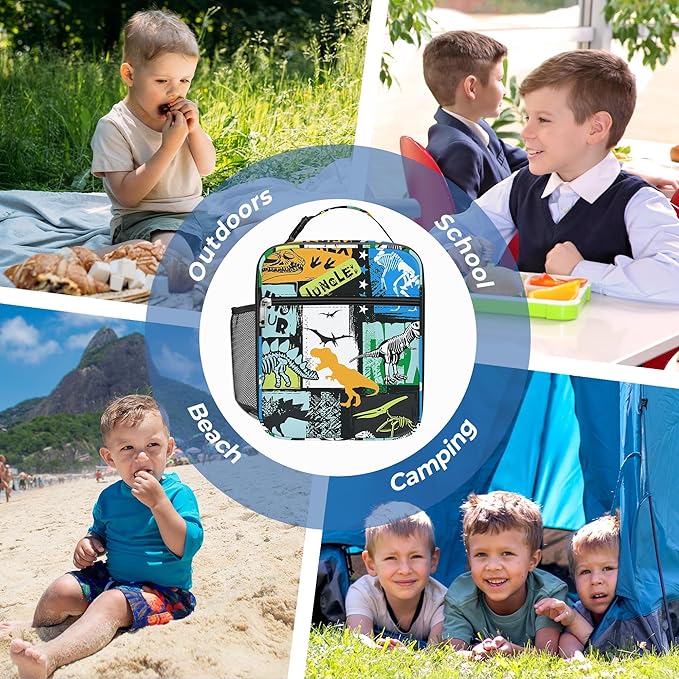 Clastyle Black Dinosaur Insulated Lunch Bag for Kids, Portable Large Thermal Cooler Lunch Bag for Boys, School Lunch Box Bag with Bottle Holder