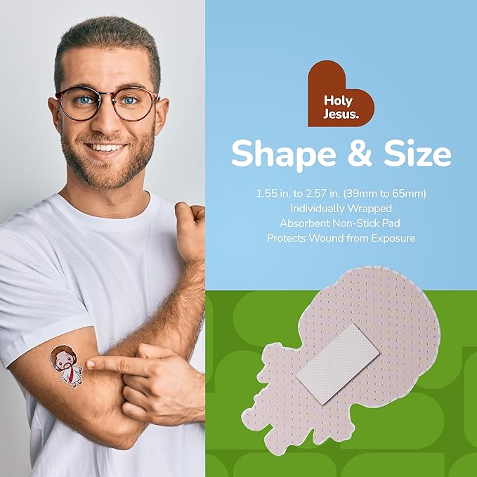 - HOLY JESUS BANDAGES: This 24 piece pack of Jesus shaped bandages is great for putting a smile on kids' faces while protecting wounds such as cuts, scrapes, and burns; sticky bandages come in a cute cardboard box and are perfect for kids and adults alike, and also for school nurses and pediatric doctors