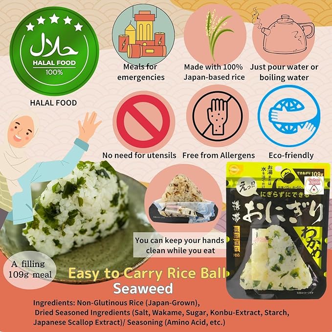 - ✅ Seaweed Wakame Onigiri Easy to Carry portable Dried Rice Ball made with 100% Japan based Alpha Rice manufactured by Onisi Foods (Japanese Food Company).