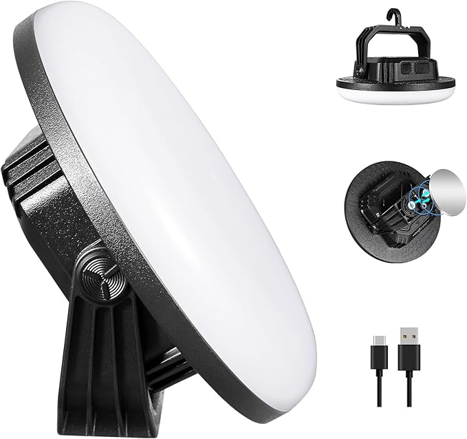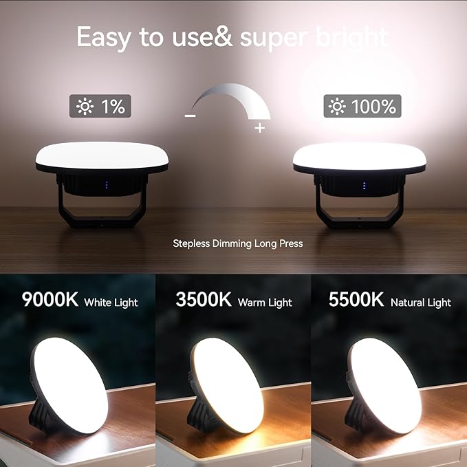 - [3 lighting modes & Stepless Dimming]: Our camping lights is dimmable, Short press to switch between 3 lighting modes (3500K/5500K/9000K), Long press to adjust brightness, providing you with the perfect lighting for any occasion, whether it's a cozy campfire setting or a bright emergency situation.