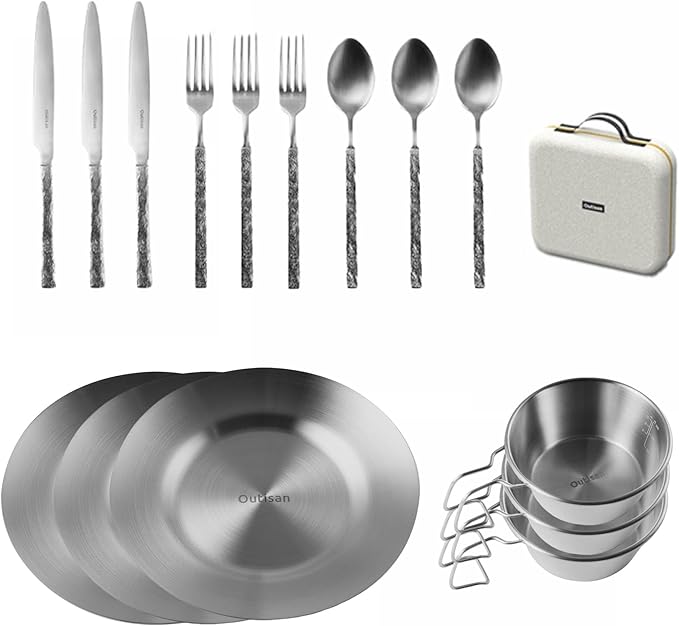 - 【All-in-One Camping Set】Includes camping plates, cups, bowls, and utensils for 3 people. A complete camping mess kit designed for convenience and style in outdoor dining