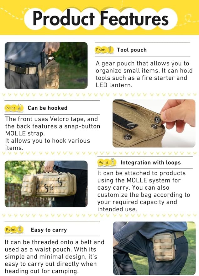- 【Easy to Carry】It can be threaded onto a belt and used as a waist pouch. With its simple and minimal design, it can be easily taken along when heading out for camping.
