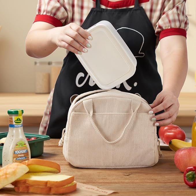 Corduroy Lunch Tote Bag, Pure Beige, Insulated Thermal Cooler, Portable and Large Capacity for Office, School, or Picnic, 8.5L