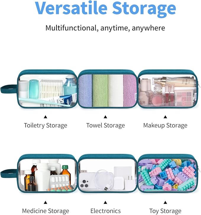 Narwey Clear Travel Toiletry Bags for Traveling Toiletries Men Women, Clear Makeup Bag Cosmetic Bag with Zipper, Make Up Pouch Organizer Bags with Handle, Skincare Bag (Teal)