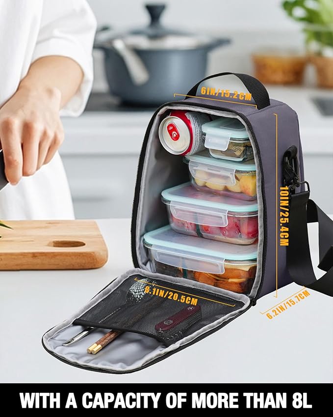 - Large Capacity & Smart Storage:With dimensions of 9 x 9 x 10.5 inches, the spacious main compartment fits three to four food storage containers. The front drawstring pocket accommodates most popular water bottle brands and sizes with handles or straight designs. Side mesh pockets and an interior net compartment keep utensils, keys, and essentials organized.