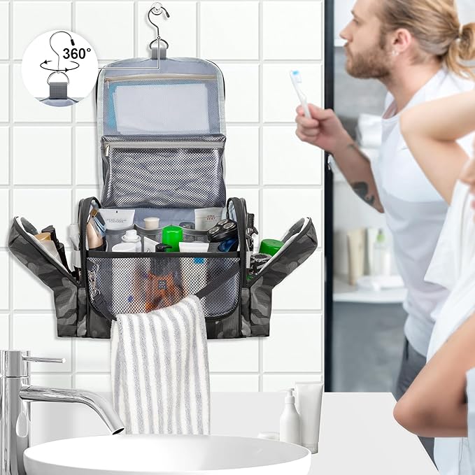 Hanging Toiletry Bag for Men, Tactical Dopp Kit Toiletry Travel Bag, Large Hygiene Organizer Shower Bag for Camping Outdoor, Black Camo