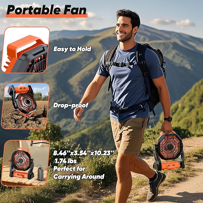 - Adaptable & Resilient Design: Complete with hooks for easy suspension on tents, umbrellas, or hammocks, this USB battery-powered fan offers 270° rotation for precise control over airflow. Its ultra-portable design, complemented by a convenient handle, ensures effortless transportability, while the bottom hook enables hands-free cooling in diverse environments. Revel in a refreshing breeze wherever your journey takes you, be it camping, picnicking, or unwinding at home.