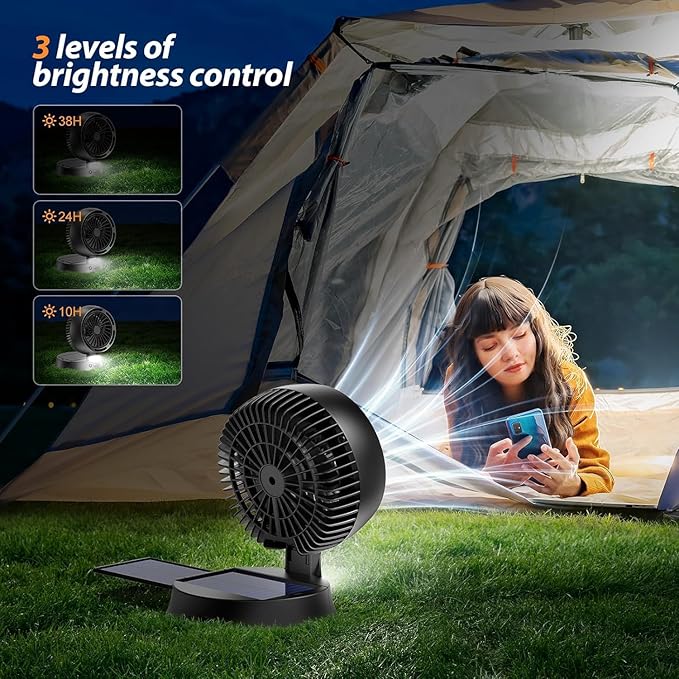 - 【Brightness Lantern】This camping fan incorporates soft, non-glaring LED lights with 3 levels of brightness. When night falls during your camping escapades, these lights not only illuminate your campsite but also create a cozy and safe atmosphere.