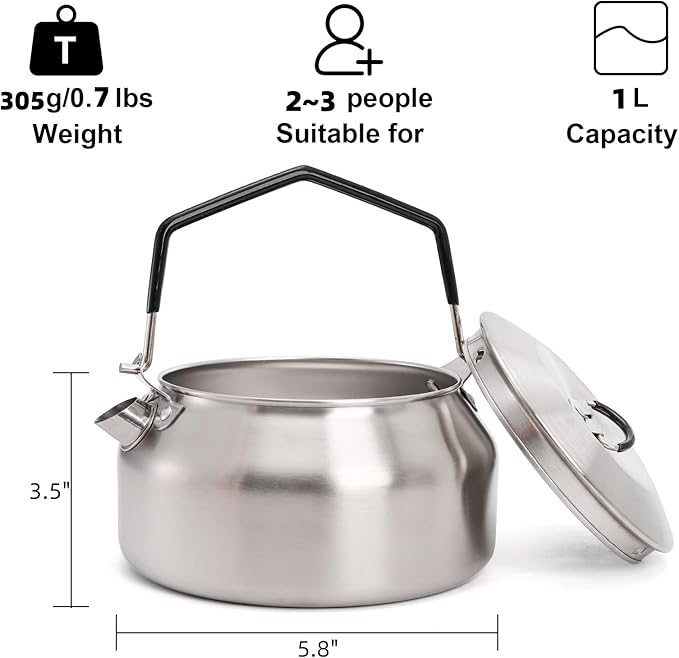 - What You Get: The stainless steel camping kettle with 1L capacity could offer approximately 4 cups water or campfire coffee, which is perfect for sharing hot beverages with friends or family during your outdoor activities