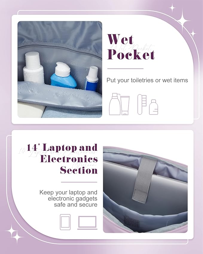 - Wet and Dry Sports Gym Bag: This women's travel bag is made of high quality waterproof fabric that is durable, waterproof and tear resistant. The zippered, waterproof PVC-lined pockets make it easy to store wet clothes, bathing suits or towels. Whether you're hiking, exploring the city, or taking a weekend getaway, this women's travel bag will be a reliable companion.