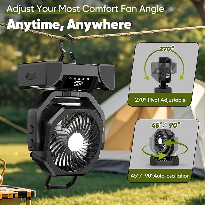 - 【45°/90° Oscillation & 270° Pivoting】Our travel fan portable supports horizontal 45°/90° auto-oscillation (angle also can be fixed) and vertically upside-down 270° manually pivoting. There are a foldable hidden hook under the fan bottom, you can hang it on a rope or a tree branch and cool it the way you like. Your fan, your way!