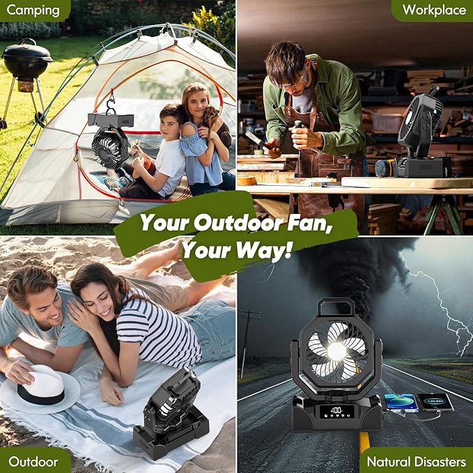 - 【Real 20000mAh Rechargeable Battery】Our portable rechargeable fan equips a large 20000mAh battery. It not only supports non-stop cooling for up to 72 hours (vs others 58 hours), but also supports 120 hours of reliable emergency lighting. In addition, our portable camping fan can function as an outdoor emergency power bank. With the upgraded 5V/3A Type-C and USB output port, outdoor battery operated fan provides two timely power supplies for electronics during camping trips, travel, Home Power outages, Hurricanes, earthquakes, Wildfires, Etc.
