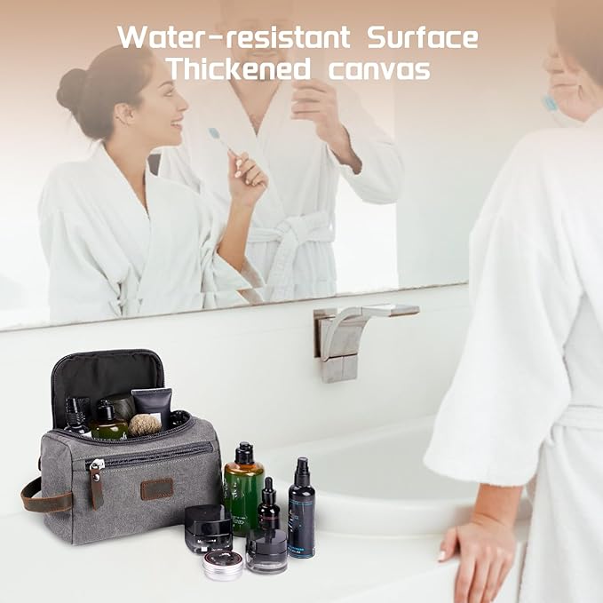 Men's Canvas Toiletry Bag, Large Capacity Men's Travel Portable Toiletry Bag, Organizer Dopp Kit Leather Accessory, Water-resistant Shaving Pouch, Birthday/Anniversary/Groomsmen Gifts for Him- Grey