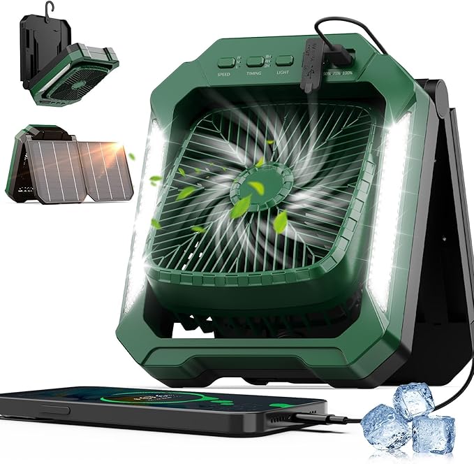 - 【Multi Angle Air Supply&Timing】This solar powered fan has a 270 ° ultra wide angle manual adjustment function, allowing you to adjust the air supply direction freely, whether it is inside the tent or in the camping area, the portable camping fan can achieve all-round comfortable air supply. With smart timer (2/4/8h options), it auto-shuts at night for energy-saving convenience. These two intelligent designs work together to deliver worry-free cooling for your outdoor adventures!