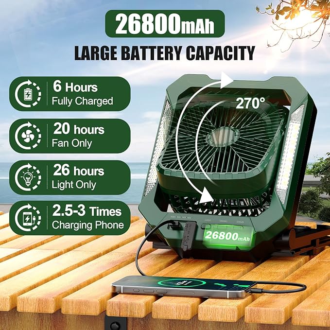 - 【26800mAh Large Battery Power】 Camping fan battery powered comes with a built-in 26800mAh high-capacity rechargeable battery supporting charging via a Type-C input port. A portable rechargeable fan with light can also be used as a backup power source for your electronic appliances under urgent circumstances, especially during a power outage due to uncontrollable weather. Solar camping fan battery operated can offer 20 hrs cooling fan or 24+ hrs light after 6 hrs once full charge.