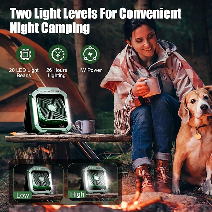 - 【Super Bright LED Light】 The battery powered fan rechargeable consists of 20 ultra-bright LED bulbs designed to illuminate your surroundings during the night outdoors. The portable camping fan has 2 brightness.High mode delivers 5m glare-free illumination for cooking/reading, while low mode creates cozy ambient light.