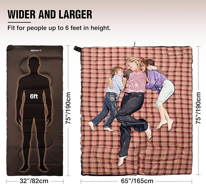 - Versatile Design: Measuring 75x32”, this outdoor sleeping bag is recommended for individuals under 6ft in height. It offers multiple usage scenarios. It functions as a traditional sleeping bag for a restful night's sleep. When fully unfolded, it transforms into a comfortable quilt that can be draped over your body for added warmth indoors or outdoors. Additionally, it can be laid flat as a picnic mat, providing a clean and comfortable surface for outdoor dining and relaxation.