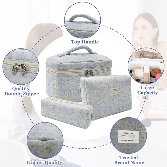 3pc Makeup Bag Set, Quilted Makeup Bag Set, Large Floral Cosmetic Bag for Women, Cute Cotton Makeup Bags, Flower Travel Toiletry Organizer Bag (Green Leaves Blue Flowers)