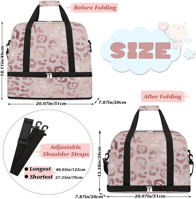 Leopard Print Foldable Travel Duffel Bag, Expandable Sports Gym Bag with Shoes Compartment Weekender Overnight Totes Bags for Women Men