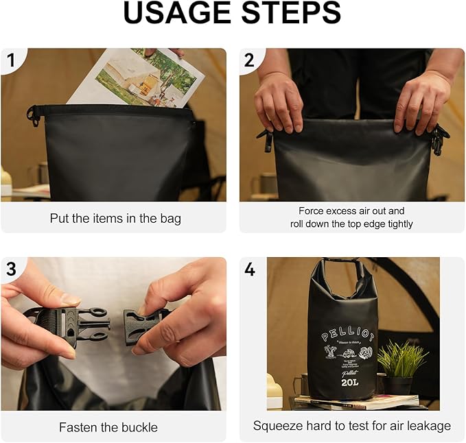 - SPACIOUS 20L DRY BAG: Easily store all your essentials with the PELLIOT 20L dry bag. Simply open the bag, load your items, roll the top down 3 to 5 times, and secure it with the buckle. The number of rolls controls the volume of the bag. Designed to protect your gear from water damage, it keep dry in wet conditions