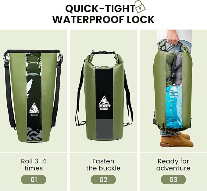 - Transparent Window Design: OneTigris dry bag has a clear viewing panel on the front, allowing you to easily and quickly see the contents without opening the dry bag, making it simple to find the gear you need without the hassle of digging through. This design beats most opaque waterproof bags on the market, making it super easy and fast to grab your gear when you’re on the go