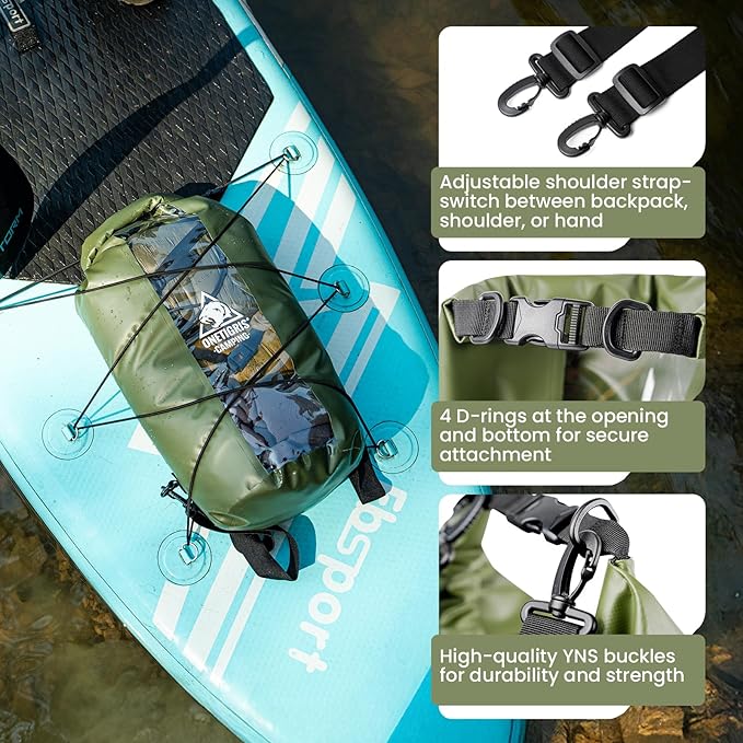 - Adjustable and Removable Shoulder Strap Design: This dry bag backpack supports multiple carrying options, including double-shoulder, single-shoulder, and hand-carry, offering comfort and convenience. The strap length can be easily adjusted to suit personal preferences. The waterproof backpack features 4 D-rings at the top and bottom, allowing you to securely fasten it to a boat or kayak, preventing items from falling and ensuring peace of mind during thrilling outdoor adventures