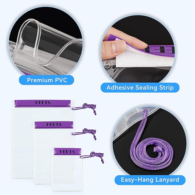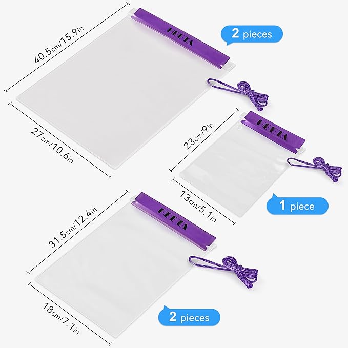 - Different Sizes: The waterproof bags with lanyard contain three sizes: Large: 15.9" x 10.6"; Medium: 12.4" x 7.1"; Small: 9" x 5.1". You can choose different sizes according to your needs