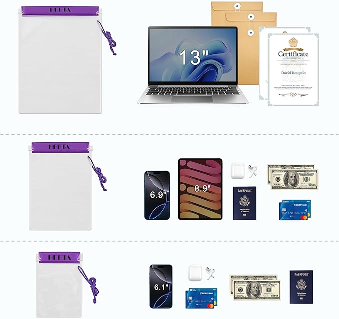 - Multiple Seals: Use seamless professional technology, not easy to tear. Sealing strips, Fold down protection, and magic tape gives your items multiple protections. It can prevent water, humidity, dust, sand, and snow from damaging your valuables